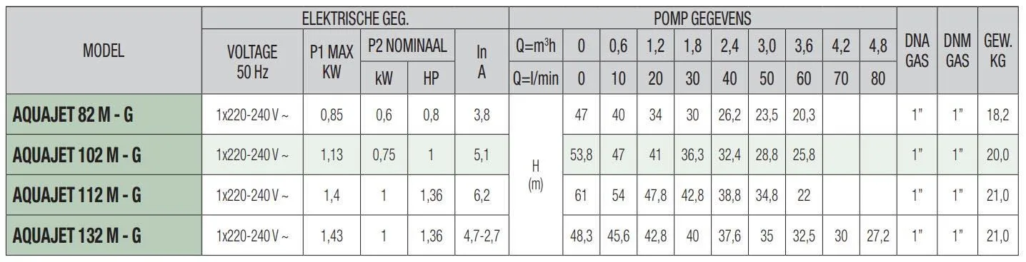 Die DAB Aquajet ist für den Dauerbetrieb geeignet und kann Wasser bis zu einer Tiefe von 8 Metern ansaugen. Die Pumpe hat eine maximale Pumpkapazität von 3.600 Litern pro Stunde und eine maximale Förderhöhe von 47 Metern (4,7 bar). Die DAB Aquajet ist eine 230V Pumpe mit einer Leistung von 0,6 kW und wird standardmäßig mit Anschlusskabel/Stromkabel geliefert.