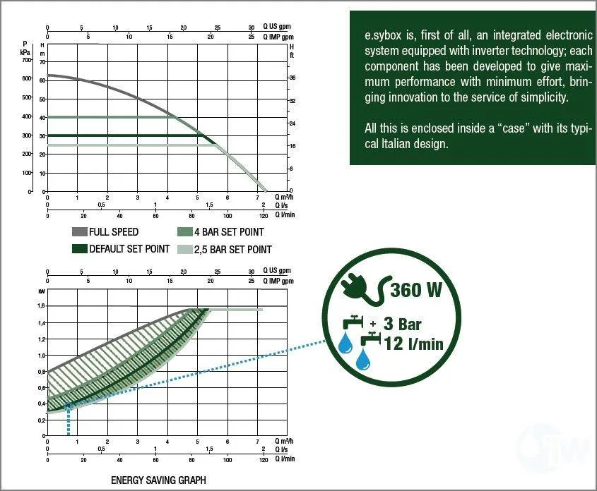 Die E.sybox ist ein voll integriertes System, bei dem die hydraulischen Komponenten von einem voll programmierbaren Frequenzregler gesteuert werden. Diese Frequenzsteuerung sorgt dafür, dass die Pumpe ihre Drehzahl an den erforderlichen Wasserbedarf und den entsprechenden Druck anpasst. Dies führt zu einem sehr konstanten Wasserdruck und zu Einsparungen bei den Energiekosten. Im Vergleich zu einer herkömmlichen Hydronikpumpe arbeitet die DAB e.sybox 50% energieeffizienter. Außerdem verlängert sich dadurch die Lebensdauer der DAB E.sybox Hydropumpe, so dass Sie möglichst lange Freude an ihr haben.