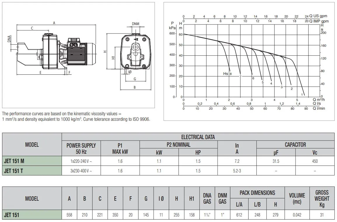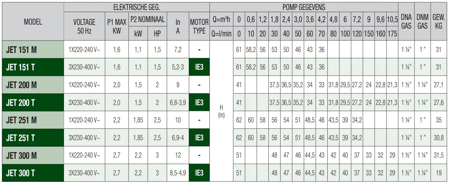 Die DAB Jet 151 T ist für den Dauerbetrieb geeignet und kann Wasser bis zu einer Tiefe von 8 Metern ansaugen. Die Pumpe hat eine maximale Pumpkapazität von 4.200 Litern pro Stunde und eine maximale Förderhöhe von 61 Metern (6,1 bar). Die DAB Jet 151 T ist eine 400V Pumpe mit einer Leistung von 1,1 kW und wird standardmäßig ohne Anschlusskabel/Stromkabel geliefert.