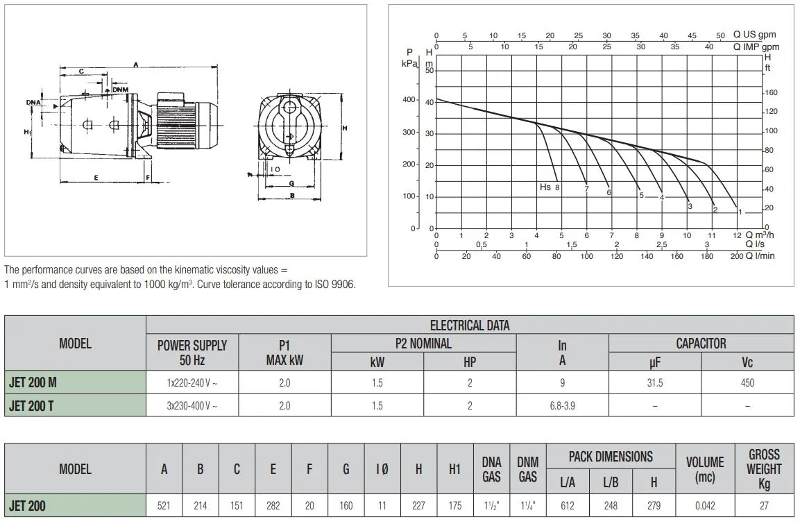 Die DAB Jet 200 T ist für den Dauerbetrieb geeignet und kann Wasser bis zu einer Tiefe von 8 Metern ansaugen. Die Pumpe hat eine maximale Pumpkapazität von 10.500 Litern pro Stunde und eine maximale Förderhöhe von 41 Metern (4,1 bar). Die DAB Jet 200 T ist eine 400V Pumpe mit einer Leistung von 1,5 kW und wird standardmäßig ohne Anschlusskabel/Stromkabel geliefert.