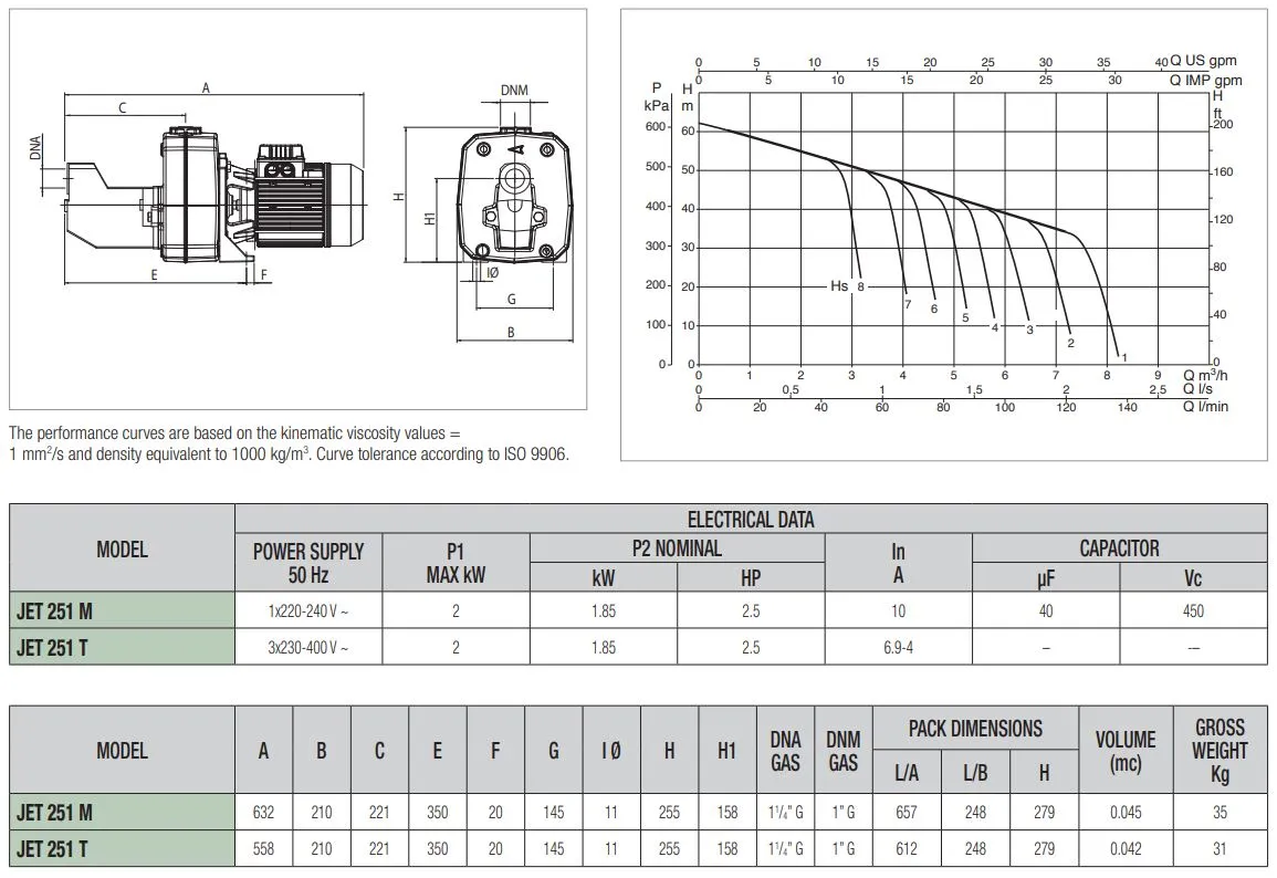 Die DAB Jet 251 M ist für den Dauerbetrieb geeignet und kann Wasser bis zu einer Tiefe von 8 Metern ansaugen. Die Pumpe hat eine maximale Pumpkapazität von 7.200 Litern pro Stunde und eine maximale Förderhöhe von 62 Metern (6,2 bar). Die DAB Jet 251 M ist eine 230V Pumpe mit einer Leistung von 1,85 kW und wird standardmäßig ohne Anschlusskabel/Stromkabel geliefert.