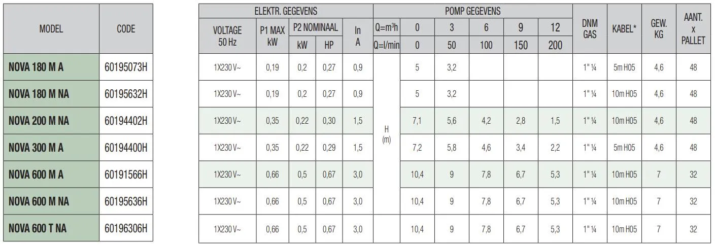 Die DAB Nova 600 T-NA SV ist nicht mit einem Schwimmerschalter ausgestattet, was bedeutet, dass er sich nicht automatisch ein- und ausschaltet, je nach Wasserstand. Suchen Sie eine Pumpe, die sich automatisch ein- und ausschaltet? Wählen Sie dann die DAB Nova 600 M-A SV. Dies ist übrigens eine 230V Pumpe.