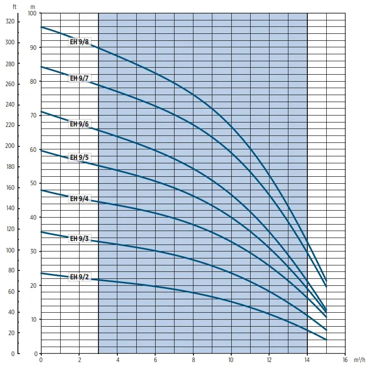 Die Franklin EH 9/8 ist nicht selbstansaugend und soll mit einem Rückschlagventil montiert werden. Die Pumpe hat eine maximale Pumpkapazität von 14.000 Litern pro Stunde und eine maximale Förderhöhe von 90 Metern (9,0 bar). Die Franklin EH 9/8 ist eine 400V Pumpe mit einer Leistung von 3 kW und wird standardmäßig ohne Anschlusskabel/Stromkabel geliefert.