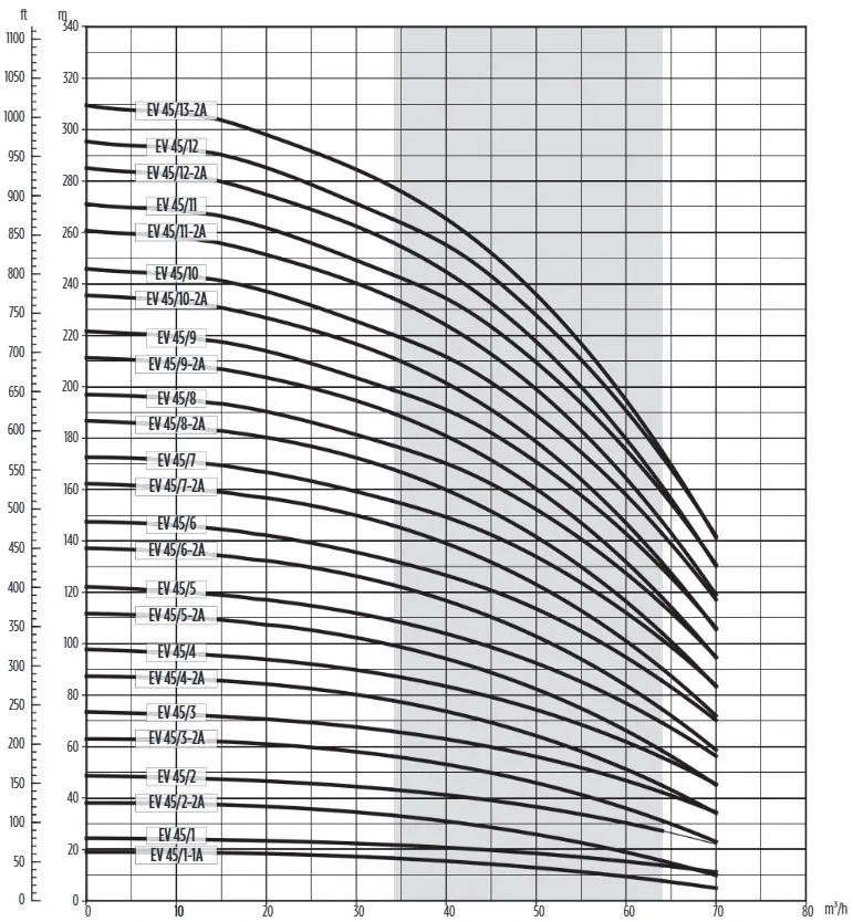 Die Franklin EV 45/4 ist nicht selbstansaugend und soll mit einem Rückschlagventil montiert werden. Die Pumpe hat eine maximale Pumpkapazität von 65.000 Litern pro Stunde und eine maximale Förderhöhe von 87 Metern (8,7 bar). Die Franklin EV 45/4 ist eine 400V Pumpe mit einer Leistung von 15 kW und wird standardmäßig ohne Anschlusskabel/Stromkabel geliefert.