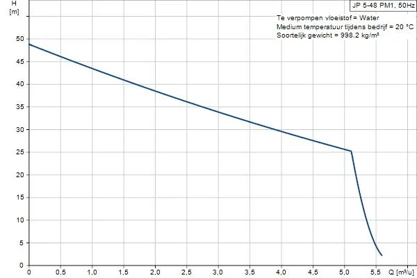 Die Grundfos JP 5-48 PM1 verfügt über einen eingebauten Thermoschutz und kann Wasser bis zu einer Tiefe von 8 Metern ansaugen. Die Pumpe hat eine maximale Pumpkapazität von 5.000 Litern pro Stunde und eine maximale Förderhöhe von 48 Metern (4,8 bar). Die Grundfos JP 5-48 PM1 ist eine 230V Pumpe mit einer Leistung von 1 kW und wird standardmäßig mit Anschlusskabel/Stromkabel geliefert.
