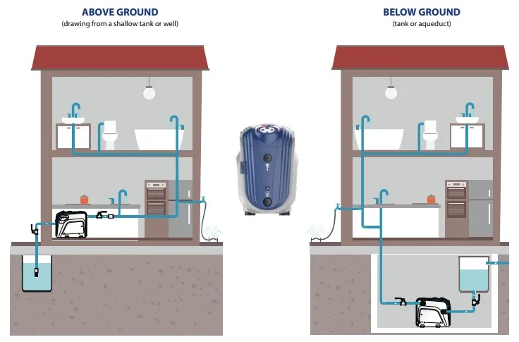 Die Pedrollo DG-BLU 3 eignet sich für den Einsatz in Ein- und Zweifamilienhäusern. Es ist auch möglich, die DG-BLU in einer Doppelanordnung zu installieren. Die Kapazität kann dann für größere Anwendungen genutzt werden. Die Installation kann sowohl oberirdisch (Tank/Quelle) als auch unterirdisch (Tank/Anlage) erfolgen.
