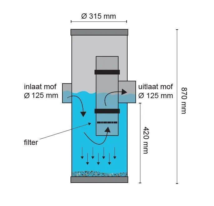 Schmutz fließt auf einer Seite in den Schacht und setzt sich am Boden des Schachts ab. Dank des Filters fließt nur sauberes Wasser in den Kasten. Der Filter ist abnehmbar, sodass der Schacht zum Entfernen von Ablagerungen frei zugänglich ist.