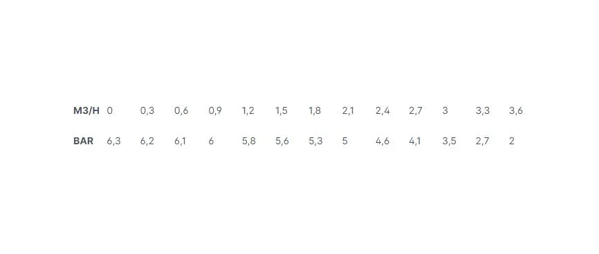M3/H | 0 | 0,3 | 0,6 | 0,9 | 1,2 | 1,5 | 1,8 | 2,1 | 2,4 | 2,7 | 3 | 3,3 | 3,6 |