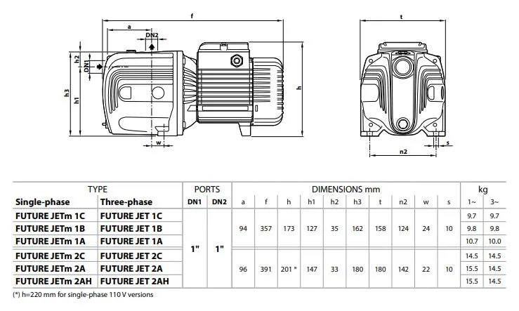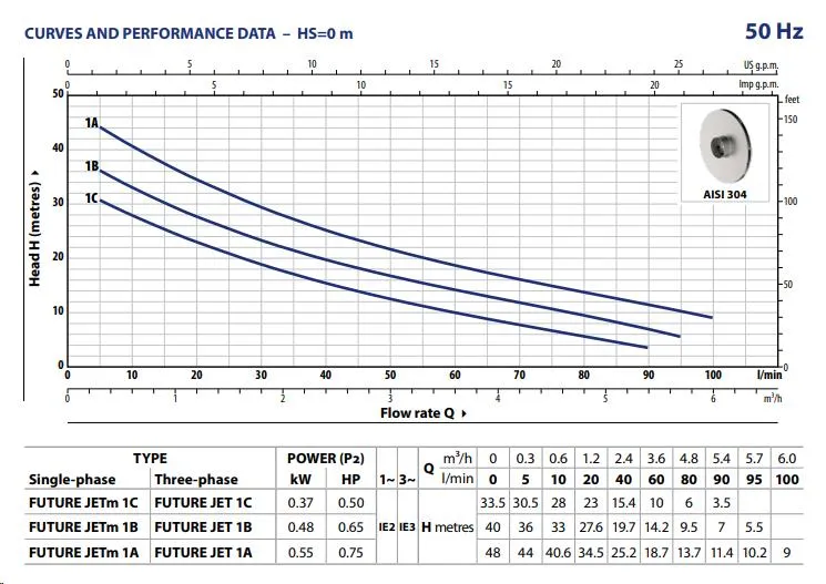 Der Pedrollo Future JETm 1A verfügt über eine Saugtiefe von 9 Metern und ist somit ideal zum Ansaugen von Wasser in großen Tiefen. Die Pumpe hat eine maximale Pumpleistung von 6.000 Litern pro Stunde und eine maximale Förderhöhe von 48 Metern (4,8 bar). Die Pedrollo Future JETm 1A ist eine 230V Pumpe mit einer Leistung von 0,55 kW und wird standardmäßig ohne Anschlusskabel/Stromkabel geliefert.
