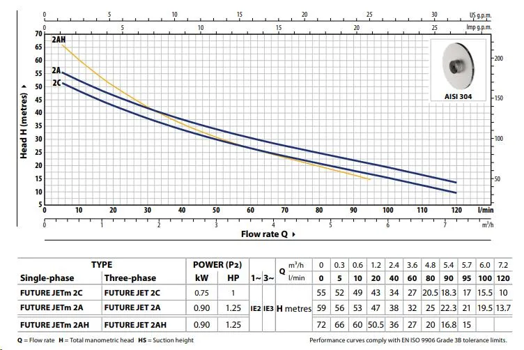 Der Pedrollo Future JETm 2A verfügt über eine Saugtiefe von 9 Metern und ist somit ideal zum Ansaugen von Wasser in großen Tiefen. Die Pumpe hat eine maximale Pumpleistung von 6.600 Litern pro Stunde und eine maximale Förderhöhe von 32 Metern (3,2 bar). Die Pedrollo Future JETm 2A ist eine 230V Pumpe mit einer Leistung von 0,75 kW und wird standardmäßig mit Anschlusskabel/Stromkabel geliefert.