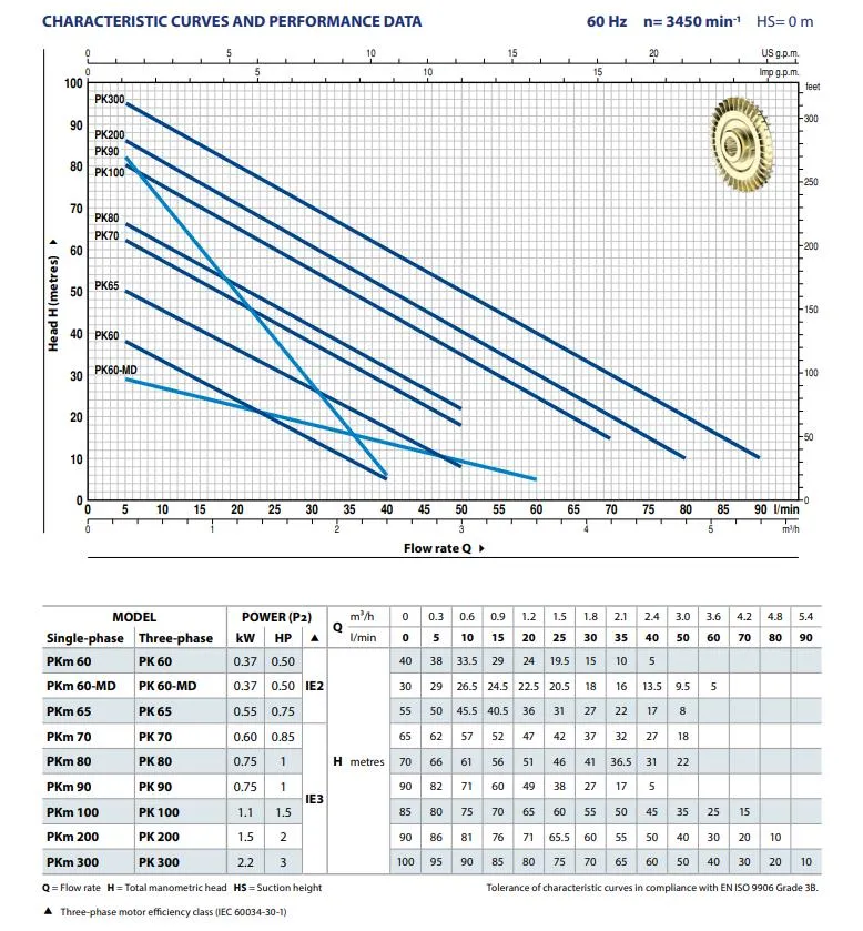 Die Pedrollo PKm 90 ist nicht selbstansaugend und soll mit einem Rückschlagventil montiert werden. Die Pumpe hat eine maximale Pumpkapazität von 2.400 Litern pro Stunde und eine maximale Förderhöhe von 82 Metern (8,2 bar). Die Pedrollo PKm 90 ist eine 230V Pumpe mit einer Leistung von 0,75 kW und wird standardmäßig ohne Anschlusskabel/Stromkabel geliefert.