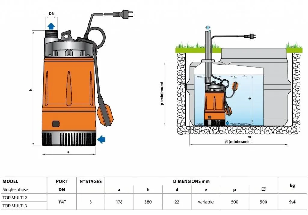 Die Pedrollo Top Multi 2 Tauchpumpe ist eine effiziente Tauchpumpe, die für die Förderung von sauberem und leicht verschmutztem Abwasser konzipiert ist. Die Pumpe hat eine maximale Durchlassgröße von 10 mm, was bedeutet, dass sie Wasser mit Feststoffen bis zu 10 mm verarbeiten kann. Die Pedrollo Top Multi 2 Tauchpumpe ist mit einem Mehrlaufradsystem ausgestattet. Dadurch baut sie problemlos mehr Druck auf als eine Tauchpumpe mit einem normalen Laufradsystem.