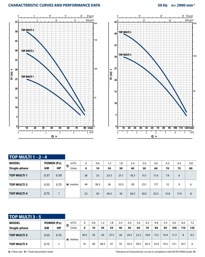 Die Pedrollo Top Multi 2 hat einen Doppelmantel und verfügt über einen eingebauten thermischen Schutz. Die Pumpe hat eine maximale Pumpkapazität von 4.800 Litern pro Stunde und eine maximale Förderhöhe von 42 Metern (4,2 bar). Die Pedrollo Top Multi 2 ist eine 230V Pumpe mit einer Leistung von 0,55 kW und wird standardmäßig mit einem 10 Meter langen Stromkabel geliefert.
