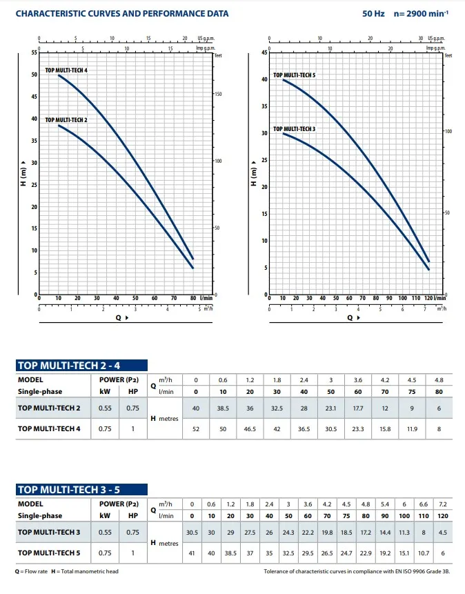 Die Pedrollo Top Multi Tech 4 hat einen Doppelmantel und verfügt über einen eingebauten thermischen Schutz. Die Pumpe hat eine maximale Pumpkapazität von 4.800 Litern pro Stunde und eine maximale Förderhöhe von 52 Metern (5,2 bar). Die Pedrollo Top Multi 4 ist eine 230V Pumpe mit einer Leistung von 0,75 kW und wird standardmäßig mit einem 10 Meter langen Stromkabel geliefert.