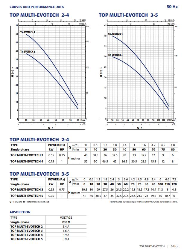 Die Pedrollo Top Multi Tech 5 hat einen Doppelmantel und verfügt über einen eingebauten thermischen Schutz. Die Pumpe hat eine maximale Pumpkapazität von 7.200 Litern pro Stunde und eine maximale Förderhöhe von 41 Metern (4,1 bar). Die Pedrollo Top Multi 3 ist eine 230V Pumpe mit einer Leistung von 0,75 kW und wird standardmäßig mit einem 10 Meter langen Stromkabel geliefert.