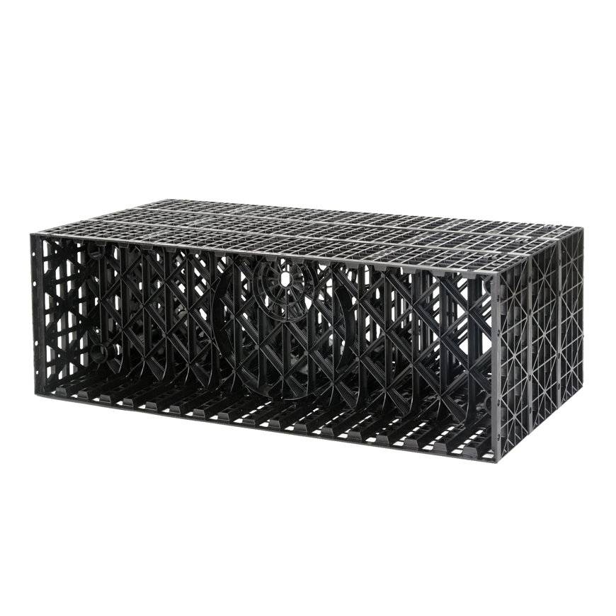 Dieser Sickerspeicher ist ideal für die Erstellung und Stapelung größerer Versickerungssysteme. Da kein Geotextil vorhanden ist, lassen sich mehrere Versickerungskästen leicht miteinander verbinden. Durch die relativ großen Abmessungen lässt sich schnell ein großes Regenwasser-Versickerungssystem aufbauen.